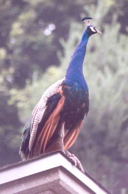 A fine Pea Cock sitting on a roof. These birds are quite numerous in the Park and run free.