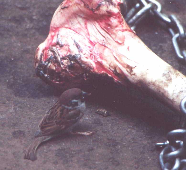 Even small birds will eat meat if given the chance. This sparrow is risking all by picking